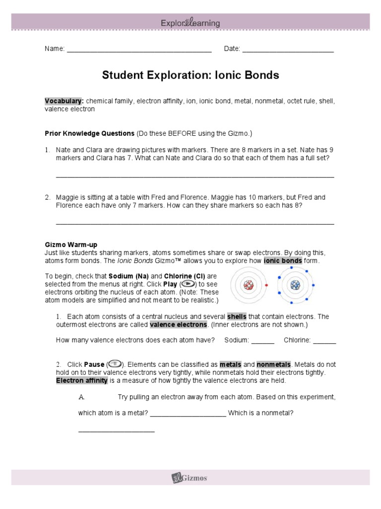 Student Exploration Ionic Bonds Answer Sheet - Copy Of Ionic Bonds Gizmo Lab Name Date Student Exploration Ionic Bonds Directions Follow The Instructions To Go Through The Simulation Respond To The Questions Studocu - Additional metal and nonmetal atoms can be added to the screen, and the resulting chemical formula can be displayed.